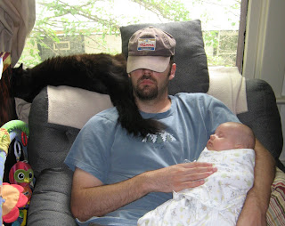 Molly's gradually getting into a daytime napping routine. Sometimes in her crib, most days in her chair, but last weekend in daddy's arms. Neko decided to join in nap time as well!